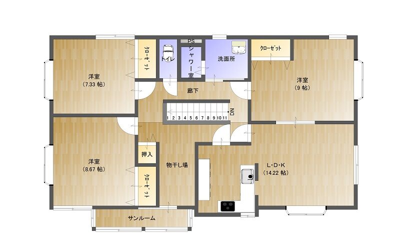3階:洋7帖、8帖、9帖、LDK14帖、トイレ、シャワー室、洗面脱衣所、サンルーム