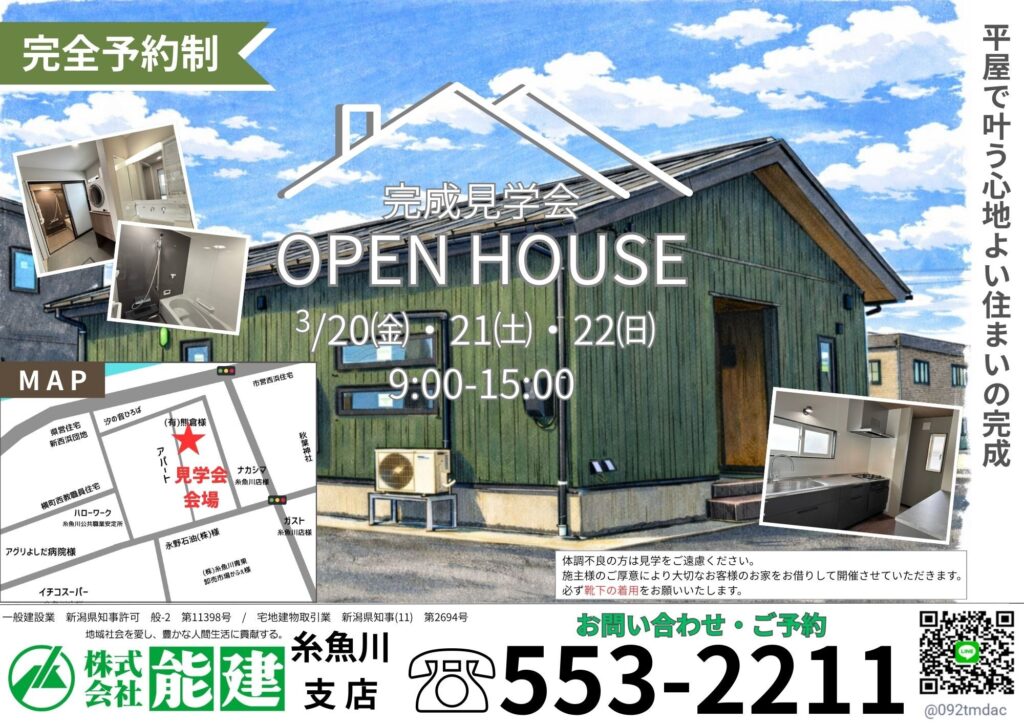 3月20日、21日、22日の3連休に糸魚川市横町地内にて完成見学会を開催いたします!!